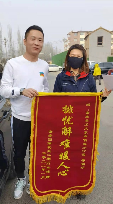 玉泉分公司員工喬娟娟在富貴國(guó)際花園走訪時(shí)得知小區(qū)二期37號(hào)樓進(jìn)入11月份后整棟樓就出現(xiàn)溫度偏低現(xiàn)象,她和同事們迅速開(kāi)始排查原因。該棟樓共有5層10戶熱用戶,他們用了一天時(shí)間逐層逐戶對(duì)熱用戶家中的濾網(wǎng)進(jìn)行了清洗,但是效果不是很理想。于是他們又對(duì)負(fù)一層主管網(wǎng)的除污器進(jìn)行了清洗,一系列的操作完成后又是整整一天,第二天回訪熱用戶時(shí)得知溫度只提升了2度,為了讓熱用戶溫暖過(guò)冬,喬娟娟又和同事們對(duì)該棟樓主管道的所有支管進(jìn)行了沖洗,再次回訪熱用戶時(shí)發(fā)現(xiàn),該棟樓其他熱用戶家中溫度都很好,只有301熱用戶家中的溫度還是偏低,為了找到原因,喬娟娟和同事們對(duì)用戶家中的暖氣管道敷設(shè)情況進(jìn)行了測(cè)量,再次沖洗了管道,同時(shí)積極聯(lián)系到已經(jīng)辦理停供的401熱用戶進(jìn)行了復(fù)供,該熱用戶家中溫度偏低問(wèn)題得到解決。"排憂解難暖人心"為了表達(dá)感謝之情,1月9日,301熱用戶聯(lián)系到了正在小區(qū)走訪的喬娟娟,親手遞給她一面錦旗。