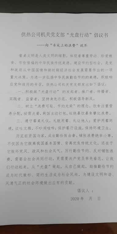 為了進(jìn)一步弘揚(yáng)中華民族勤儉節(jié)約的美德,積極響應(yīng)黨和政府的號(hào)召。9月9日上午開始,城發(fā)供熱公司機(jī)關(guān)黨支部黨員、發(fā)展對(duì)象、積極分子共40人陸續(xù)簽署“光盤行動(dòng)”倡議書。