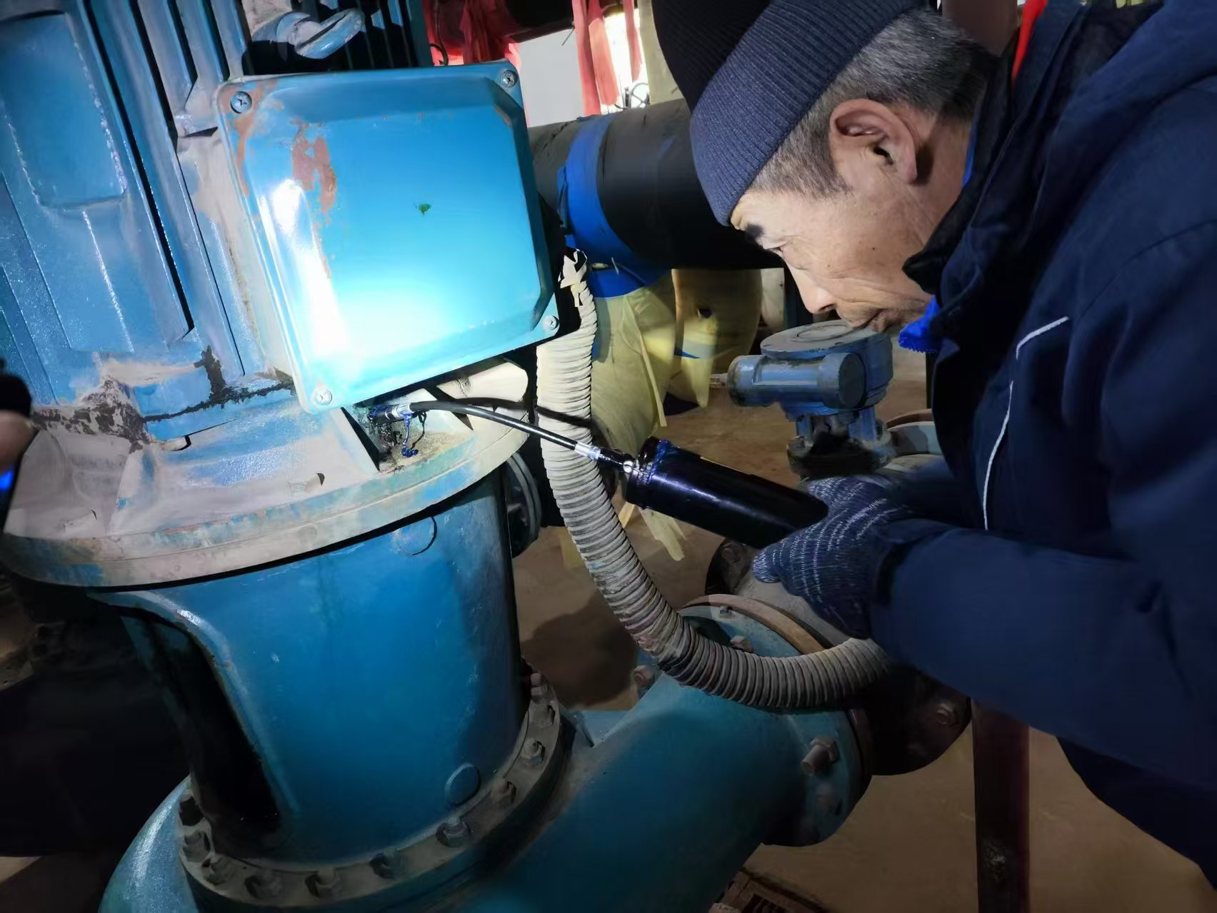 2024年12月23日晚上8點多,萬惠站內(nèi)失水掉壓,蘇昭和同事們立即沿線進行排查,找到2處跑水點。在緊張的搶修過程中,蘇昭白天配合挖機作業(yè)、抽排污水,晚上協(xié)助檢修所員工下地溝為DN300的管網(wǎng)打上2個大抱卡。經(jīng)過一天一夜的連續(xù)奮戰(zhàn),終于在24號凌晨2:00完成了搶修和回填,92個商鋪恢復了供熱。由于天氣寒冷,蘇昭和同事們身上結(jié)出了冰碴,手也凍僵了?!懊ζ饋砭皖櫜涣四敲炊嗔?,問題解決了才能松一口氣?!彼f。